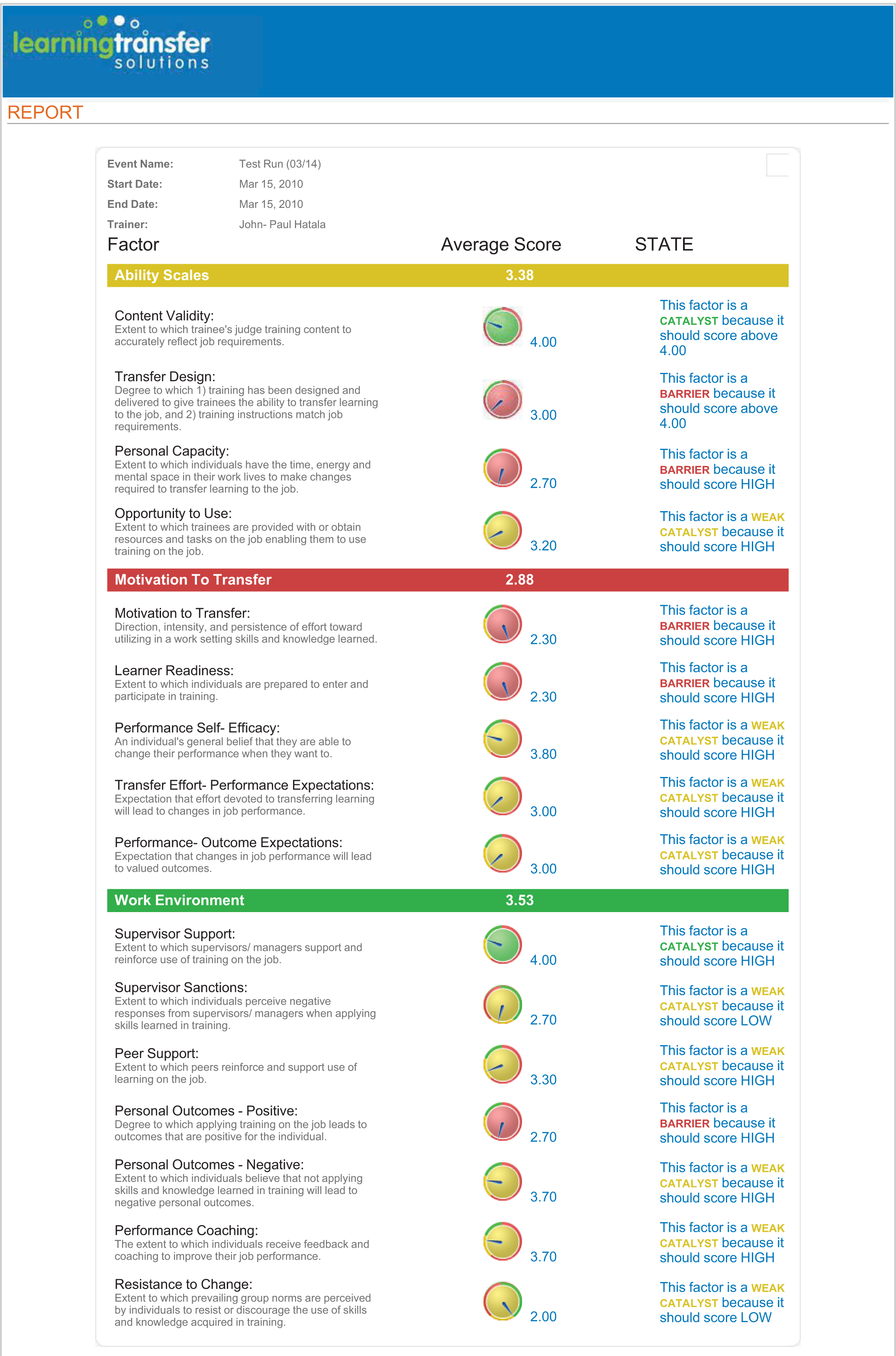 Use our Learning Transfer System Inventory (LTSI)--the only scientifically validated diagnostic tool in the world--to determine where the learning transfer barriers are in your organization. The LTSI measures 16 factors that have been shown to be potential barriers--or catalysts--for learning change. As a result of the diagnosis, you will know where the leverage points are for change in your organization.